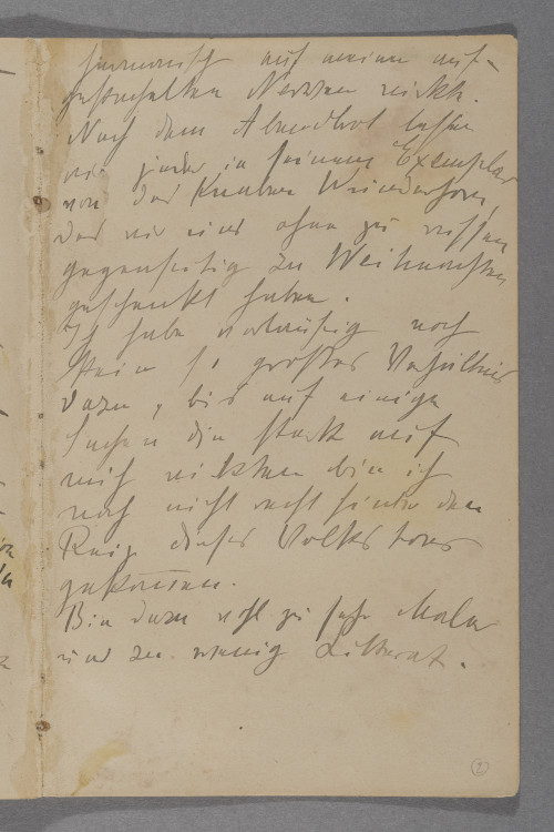 26. December 08. Sonnabend. / Spät aufgestanden. Wollte / dann arbeiten eventuell / Selbstportrait. Es war auch / schon alles im Gange als ein / Depeche von Missis Roller / kam, die sich und ihre Tochter / für Sonntag anmeldete. / Minkchen und ich beratschlagten / dann was zu thuen sei°n°, / im warmen Atelier vor dem / zum Selbstportraimalen / aufgestellten Spiegel auf dem Sofa / Wobei mir die Idee zu°m° / einem großen Doppelselbst- / portrait kam. / Ich fuhr dann nach dem / Essen in die Stadt um Missis / für morgen abzusagen und / für Sylvester einzuladen. / Traf sie nicht zu Hause / und schrieb ihr bei ihr einen / Brief der das notwendigste / enthalten sollte. Wärendem / kam sie und ihre Tochter. / Es war sehr nett. / Es ist so erstaunlich wenn / man Menschen findet, / die wirklich einmal °wirklich° / ähnlich empfinden wie man / selbst. / Dann war ich noch einen / Augenblick im Kafé Mandel / traf dann auf der Bahn / noch Molls die in die Stadt / wollten und kam um / 8 Uhr nach Haus, wo das / liebe Mink schon das / Abendbrot servirt hatte und / alles sehr beruhigend und / harmonisch auf meine auf- / gestachelten Nerven wirkte. / Nach dem Abendbrot lasen / wir jeder in seinem Exemplar / von des Knaben Wunderhorn, / das wir uns ohne zu wissen / gegenseitig zu Weihnachten / geschenkt haben. / Ich habe vorläufig noch / kein so großes Verhältnis / dazu, bis auf einige / Sachen die stark auf / mich wirkten bin ich / noch nicht recht hinter den / Reiz dieses Volkstons / gekommen. / Bin dazu wohl zu sehr Maler / und zu wenig Litterat.