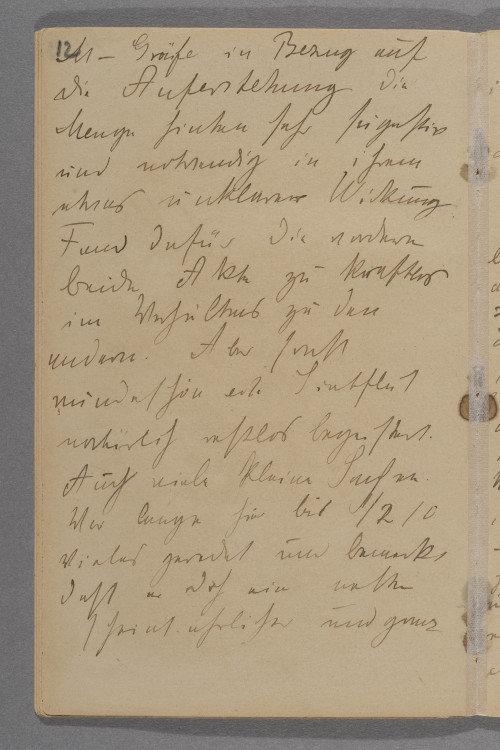<Freitag> 8.1.09 / Ich thue fast nicht‘s wie / Tagebuch führen. Muß / sagen freue mich schrecklich / nächste Woche wieder anfangen / können zu arbeiten. / Man wird brummig und / mißgestimmt und ist etwas / aufgeschmissen. / Wir wollten ein schönen Spazirgang / machen Mink und ich aber / pünktlich um ½ 3 erschien / Nauen auf der Bildfläche. / Bilderbesehen. Er war / ziemlich begeistert. Fand / gerade das Gegenteil von / M-Gräfe in Bezug auf / die Auferstehung die / Menge hinten sehr sugestiv / und notwendig in ihrem / etwas unklaren Wirkung. / Fand dafür die vorderen / beide Akte zu kraftlos / im Verhältnis zu den / andern. Aber sonst / wunderschön ect. Sintflut / natürlich restlos begeistert. / Auch viele kleine Sachen. / War lange hier bis ½ 10 / Vieles geredet und bemerkt / daß er doch ein netter / scheint ehrlicher und ganz / tief empfindender Mensch / ist. Wollen uns öfter sehen. / Brachte ihn mit Lump / zur Bahn. –