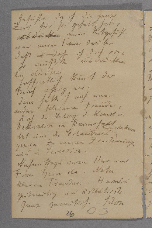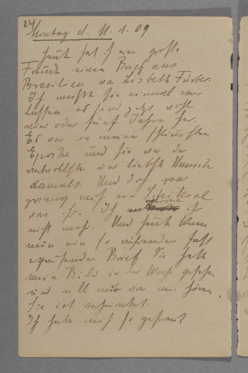 <Montag d. 11.> 1.09 / Heute hat ich eine große / Freude einen Brief aus / Brasilien von Lisbeth Färber. / ich mußte sie einmal ver- / lassen es sind jetzt wohl / vier oder fünf Jahre her. / Es war in meiner schlimmsten / Epoche und sie war der / wertvollste und liebste Mensch / damals. Und doch °war° / zwang mich ein Schiksal / von ihr. Ich °antworte° ~antwortete° ihr / nicht mehr. Und heute kam / nun ein so rührender fast / ergreifender Brief Sie hatte / mein Bild in der Woche gesehen / und will nur von mir hören. / Sie ist verheiratet. / Ich habe mich so gefreut / daß mir das Schiksal gestattet / hat eine Jugendsünde vieleicht / nachträglich etwas auszugleichen / und Schmerzen die ich verursacht / nachträglich noch etwas mildern / zu können. Ich habe ihr / sofort geschrieben so dankbar / und herzlich wie ich mich nur / irgendwie ausdrücken konnte / und wie mir wirklich zu / Mute war. Sie war so ein / furchtbar lieber feiner Mensch. / Wie °hat° ~hart~ vom Schiksal, sie / mir gerade in °meiner° ~der~ dunkelsten / und wildesten Zeit meines / Lebens und meines Charakters / in den Weg zu werfen daß / ich ihr so viele Schmerzen / bereiten mußte. / Wie freue ich mich, daß sie die / Energie und den Mut gehabt / mir ~Gelegenheit zu schaffen~ ihr meine tiefen freundschaftlichen / Gefühle die ich die ganze / Zeit für sie gehabt habe, / °ausdrücken° mein Mitgefühl / und eine Trauer darüber / daß °es doch° ich doch von / ihr mußte ausdrücken / zu dürfen. / Hoffentlich kommt der / Brief richtig an. / Dann hatte ich noch eine / andere kleinere Freude, / Koch der Verlag d. Kunst u. / Dekoration in Darmstadt / bat um die Erlaubnis ~d. Reproduktion~ / zweier °Z° meiner Zeichnungen / aus d. Secession. / Nachmittags waren Herr und / Frau Spiro da. Nette / kleine Tierchen. Harmlos / gutmüthig und ästhetisch. / Ganz gemütlich. Schon / des Morgens fiel mir der / wundervolle Anfang des / Brahms °O° Klavier Quintett ~op. 34 / ein im Allegro non tropo / als ich noch °e°ganz unter / der Freude des empfangenen / Briefes und eines mir / wiedergewonnenen Menschen stand / und auch jetzt verfolgen / mich diese wundervoll / jubelnden Rythmen. / Es war schön heute!