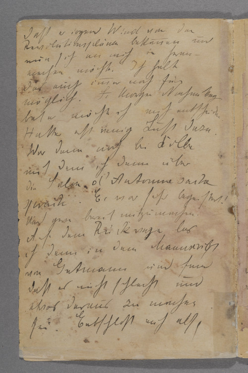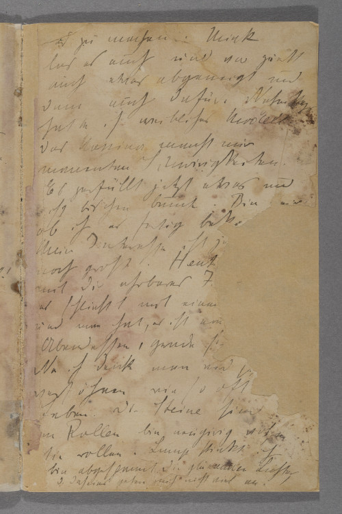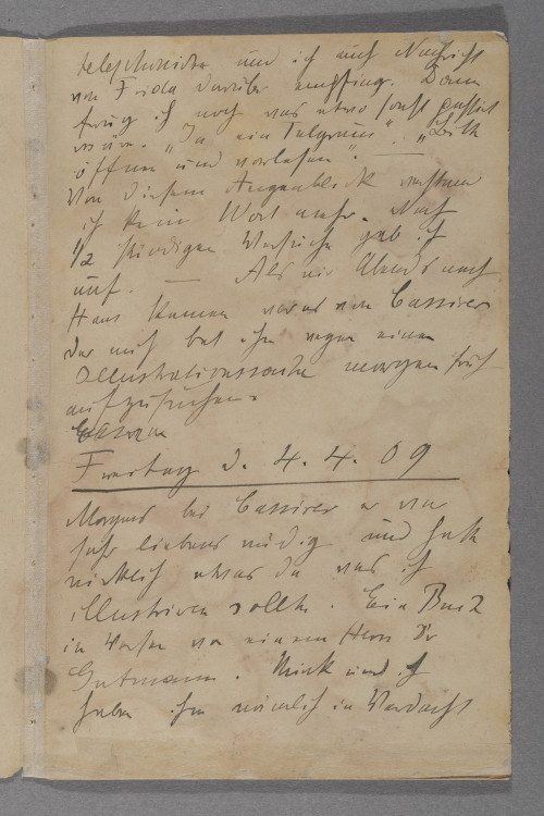 <Freitag d. 4.4.09> / Morgens bei Cassirer er war / sehr liebens würdig und hatte / wirklich etwas da was ich / illustriren sollte. Ein Buch / in Versen von einem Herrn Dr. / Gutmann. Mink und ich / haben ihm nämlich in Verdacht / daß er irgend Wind von den / Revolutionsplänen bekommen und / nun sich an mich °in° heran- / machen möchte. Ich halte / das auch immer noch für / möglich. °Sc° Morgen Nachmittag / bat er möchte ich mich entscheiden. / Hatte erst wenig Lust dazu. / War dann noch bei Kolbe / mit dem ich dann über / die Salon d‘Automnesache / sprach. Er war sehr begeistert! / Und gern bereit mitzumachen. / Auf dem Rückwege las / ich dann in dem Manuscri°b°pt / von Gutmann und fand / daß es nicht schlecht und / etwas daraus zu machen / sei. Entschloß mich also / es zu machen. Mink / las es auch und war zuerst / auch etwas abgeneigt und / dann auch dafür. Nachmittag / hatte ich weibliches Modell / Das Messina macht mir / momentan Schwirigkeiten. / Es zerfällt jetzt etwas und / ist bischen bunt. Bin n[...] / ob ich es fertig bek[...] / Mein Interesse ist je[...] / noch groß. Heute [...] / mit dir ehrbares T[...] / es schließt mit eine[...] / und man hat, es ist em[...] / Abendessen, gerade is[...] / Na ich denke man wird s[...] / versöhnen wie so oft [...] / eben die Steine sind / im Rollen bin neugirig wohin / sie rollen. Lump stinkt. ich / bin abgespannt die glänzenden Lichter / d. Daseins gehen mich nicht viel an!
