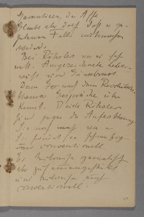 <Sonntag> d. 3. °Deze° Januar. / Mit Minkchen bei °Tuchs° / Schockens Tuchs und / Röhslers. Alle 3 Paare / zu Haus getroffen. / Mit allen Revolutionsideen / besprochen. Abgeschwächte / Stimmung. Tuch nicht / abgeneigt verlangt aber / Garantieen, der Affe. / Glaube aber doch daß er ge- / gebenen Falls mitmachen / würde. / Bei Röhslers war es sehr / nett. Ausgezeichnete Leber- / wurst und Gänsebrust. / Dann °Ges° nach dem Revolutions- / thema Gespräche über / Kunst. Beide Röhsler / sind gegen die Auferst°h°ehung / Sie noch mehr wie er / Sie findet sie schmutzig / und conventionell. / Er teilweise genialisch / aber zusammengestückt / und teilweise auch / conventionell. / Schade. Sonst aber °z° wirklich / furchtbar nette Menschen. / Nachher auch noch Sekt / bekommen.