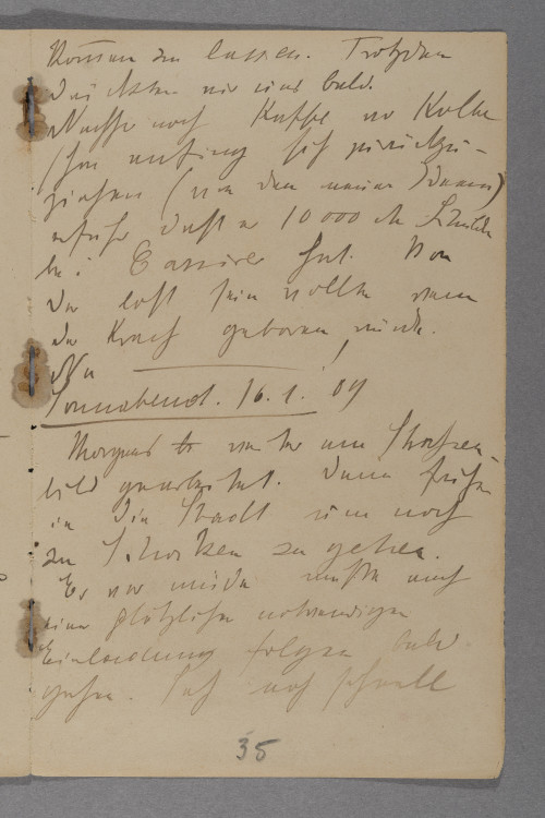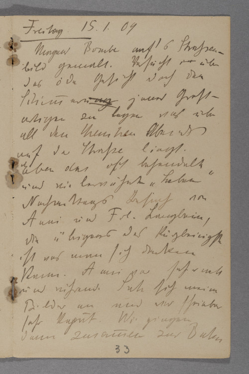 <Freitag. 15.>1.09 / Morgens Bombe auf‘s Straßen- / bild gemalt. Versucht °in° über / das öde Gesicht doch den / Schimmer°ung° jenes Groß- / artigen zu legen was über / all den Menschen Abends / auf der Straße liegt. / Eben das oft behandelte / und vielerwähnte „Leben“ / Nachmittags Besuch von / Anni und Frl. Langbein, / die übrigens das Kurzbeinigste / ist was man sich denken / kann. Anni war sehr nett / und rührend. Sah sich meine / Bilder an und war scheinbar / sehr kaput. Wir gingen / dann zusammen zur Bahn / Sie fuhren nach ihrem Nest / und ~ich~ nach Berlin in die / Secession. Nervöse Stimmung / da ich das Lokal nicht ausstehen / kann. Ankunft. Nölereien / mit Cassirer. Gegenseitiges / Anöden. Dann kam / Klinger °.° °Spä° mit Libermann / auch die üblichen andern / Existenzen. Meier Greco / Schröder wieder später Dora / unter dem Schutze des / Herrn Hermann. / Ich saß mit Kolbe Tuch / Pottner Masson zusammen / und versuchte so gut es ging / die niederträchtig stumpfsinnige / Stimmung nicht über uns / kommen zu lassen. Trotzdem / drückten wir uns bald. / Nachher noch Kaffe wo Kolbe / schon anfing sich zurückzu- / ziehen (von den neuen Ideen) / erfuhr daß er 10000 M. Schulden / bei Cassirer hat. Von / der loß sein wollte wenn / der Krach geboren würde. / Na – !