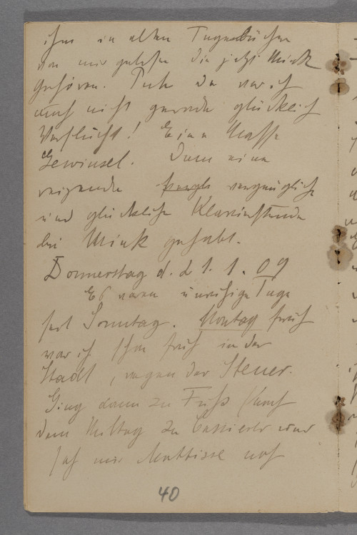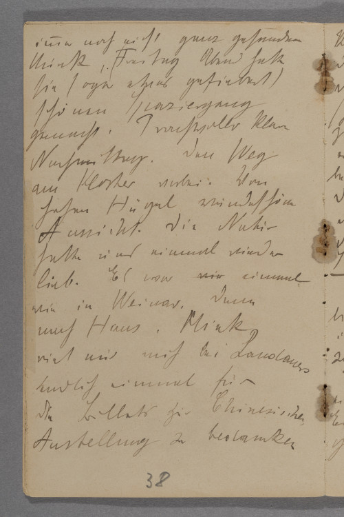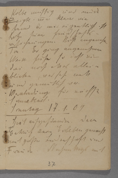 <Sonntag 17.1.> 09 / Spät aufgestanden. Dann / Entwurf zum Erdbeben gemacht / mit großer Leidenschaft und / Freude. Nachmittags mit / immer noch nicht ganz gesunder / Mink, (Freitag Abend hatte / sie sogar etwas gefiebert) / schönen Spaziergang / gemacht. Prachtvoller klarer / Nachmittag. Den Weg / am Kloster vorbei. Vom / hohen Hügel wunderschöne / Aussicht. Die Natur / hatte uns einmal wieder / lieb. Es war °wie° einmal / wie in Weimar. Dann / nach Haus. Mink / riet mir mich bei Landauers / endlich einmal für / die Billets zur Chinesischen / Austellung zu bedanken / Ich trampelte auch hin. Blieb / 10 inuten da, störte / den Brüllbruder der Frau / und wußte nicht recht was / ich sagen sollte nachdem / ich mich bedankt hatte / und 10 Augen auf / mir ruhten °mit°. Wußte / nicht was ich eigendlich bei / diesen sehr netten mir aber / ganz fremden Menschen / thuen sollte und ging / denn dann auch nachdem / ich noch eine Einladung / für nächsten Sonnabend / mit nach Haus genommen / hatte. / Sehr gutes und gemütliches / Abendbrot. Vor und nach / ihm in alten Tagebüchern / von mir gelesen die jetzt Mink / gehören. Puh da war ich / auch nicht gerade glücklich / Verflucht! Eine Masse / Gewinsel. Dann eine / reizende °fvergl° vergnügliche / und glückliche Klavierstunde / bei Mink gehabt.