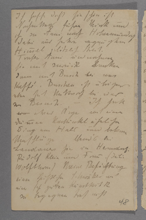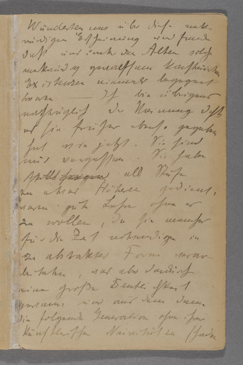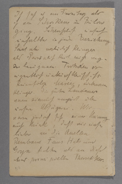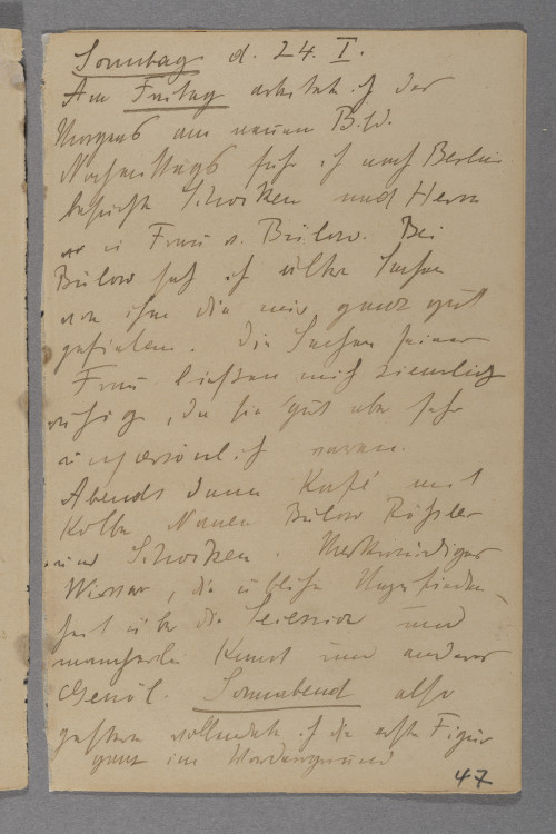 <Sonntag> d. 24. I. / Am <Freitag> arbeitete ich des / Morgens am neuen Bild. / Nachmittags fuhr ich nach Berlin / besuchte Schocken und Herrn / °vo° u. Frau v. Bülow. Bei / Bülow sah ich ältere Sachen / von ihm die mir ganz gut / gefielen. Die Sachen seiner / Frau ließen mich ziemlich / ruhig, da sie gut aber sehr / unpersönlich waren. / Abends dann Kafé mit / Kolbe Nauen Bülow Rößler / und Schocken. Merkwürdiger / Wirwar, die übliche Unzufrieden- / heit über die Secession und / mancherlei Kunst und anderes / Genöl. <Sonnabend> also / gestern vollendete ich die erste Figur / ganz im Vordergrund / Ich hoffe daß sie schön ist. / Nachmittags fuhren Mink und / ich zu Anni nach Hohenneuendorf / dabei aus heitern vergnügtem / Himmel plötzlich Streit. / Trafen Anni und nahmen / sie mit zurück tranken / dann mit Busch bei uns / Kaffé. Buschen ist übrigens / eben seit Mittwoch bei uns / zu Besuch.–Ich hatte / °ein° etwas Ärger mit einem / dummen Karbunkel ähnlichen / Ding am Hals und bekam / Umschläge. Abend’s bei / Landauers hier in Hermsdorf. / Rudolf Klein und Frau. (Julie / Wolfthorn) Meine Befürchtung / einen süßlichen Schwätzer mit / einer sehr guten Kunstkritik / zu begegnen traf nicht / ein. Er posierte zwar aber / mit einer nicht unangenehmen / Naivität °und° war zurück- / haltend und sprach kluge / Sachen. Er ist eben doch / °ni° fast der einzige Mensch / der der Kunst gegenüber so / empfindet wie ich. Teilte / sogar meine Meinung über / Marées, sogar die gewissen / °A° Charakterähnlichkeiten / mit Liebermann °z° Beide / zu sehr Gehirnkünstler. / Kein unmittelbares Verhältnis / zum Leben. Als dritter im / Bunde, jeder aber in seiner Art / ganz besonders, fiel mir / Klinger ein, dessen Brahms- / denkmal hier eben in der / Secession ausgestellt ist. / Ich sah es am Freitag als / ich von Schockens zu Bülow / ging. Scheußlich einfach / unhaltbar in jeder Beziehung. / Sonst aber natürlich Klinger / als Persönlichkeit nicht weg- / zuleugnen. Trotzdem er / eigentlich unkünstlerisch ist. / Reienfolge Marées, Liebermann / Klinger. Die guten Landauers / waren ziemlich empört über / unsere Absägerei. Wir / waren jedoch sehr einer Meinung / auch Mink, daß wir unser / lieber an die Quellen / Rembrand Frans Hals und / Goya hielten als an diese / etwas pinzipiellen Theoretiker. / Wunderten uns über diese merk- / würdigen Erscheinung und fanden / daß uns unter den Alten solche / merkwürdig gewaltsam konstruirten / Existenzen niemals begegnet / waren. – Ich bin übrigens / nachträglich der Meinung daß / es sie früher ebenso gegeben / hat wie jetzt. Sie sind / nur vergessen. Sie haben / °stillschweigend° als Stufe / zu etwas Höheren gedient, / waren gute Lehrer ohne es / zu wollen, da sie manches / für die Zeit notwendige in / zu abstrakter Form verar- / beiteten, was aber dadurch / eine große Deutlichkeit / gewann, und aus dem dann / die folgende Generation ohne ihrer / künstlerische Naivität zu schaden / künftigen Boden °füh° für / ihr eigenes Wachstum fand. [eine Seite weiter im Tagebuch, Nachtrag:] Sonntag . 24. waren wir Nachmittag / mit Anni °un° MInk und ich / in Tegel. Schöner Spaziergang.