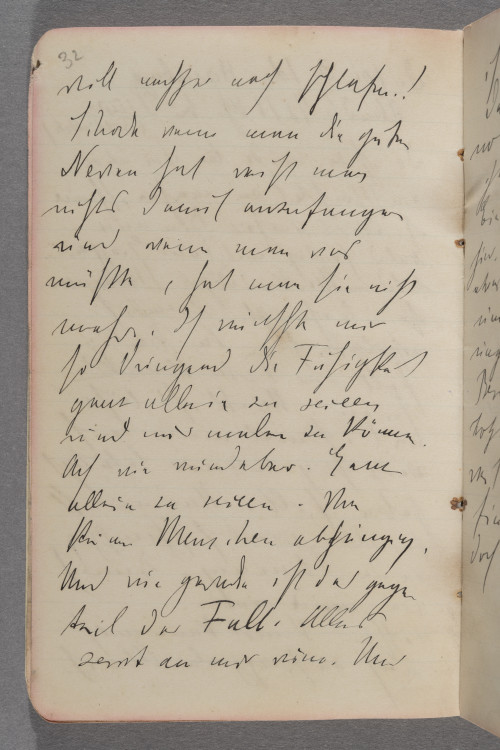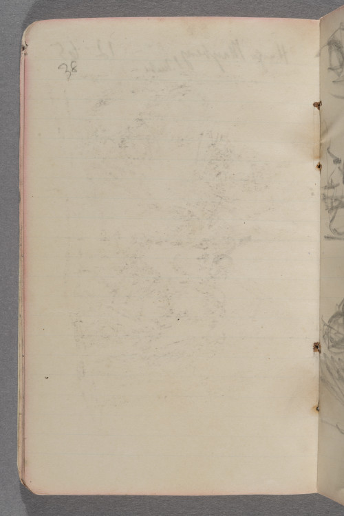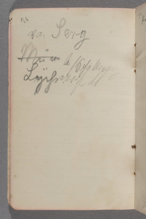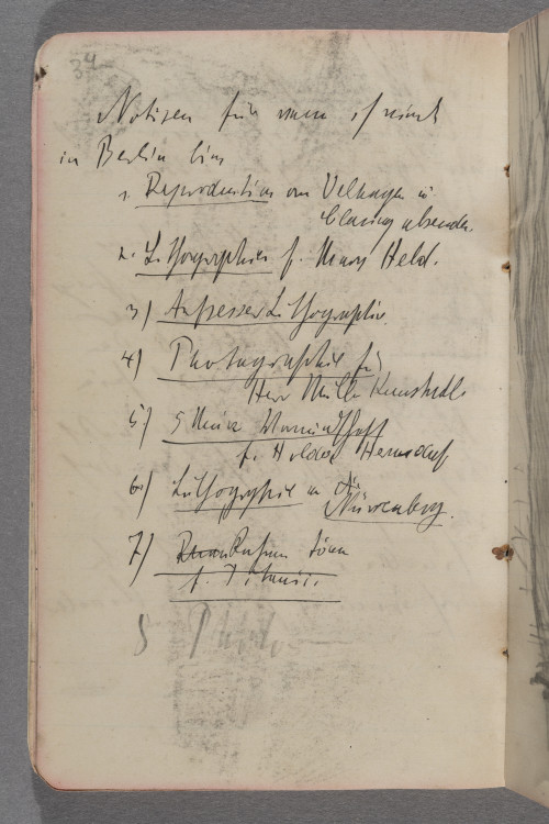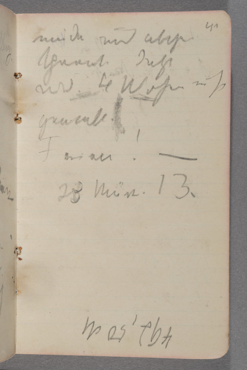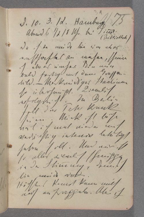 d. 10.3.12. Hamburg / Abends ½ 18 Uhr bei Simms. / (Bibliothek) / Da ich zu müde bin um etwas / ernsthaftes zu machen, schmier / ich etwas umher. Bin nun / bald fertig mit dem Gruppen- / bild.- Merkwürdiges Stadium / so überhaupt. Ziemlich / erfolgreich. In Berlin / soll der Peter krank / seien. Mink ist böse / weil ich mal wieder mich / verdächtig intensiv betätigt / haben soll. Und mir ist / so alles ziemlich schnuppe / in der Stimmung, denn ich / bin müde °und°. / Höchstens Kunst kann mich / noch aufrappeln. Aber ich / will nachher noch schlafen.! / Schade wenn man die guten / Nerven hat weiß man / nichts damit anzufangen / und wenn man was / müßte, hat man sie nicht / mehr. Ich wünschte mir / so dringend die Fähigkeit / ganz allein zu seieen / und nur malen zu können. / Ach wie wunderbar. Ganz / allein zu seieen. Von / keinem Menschen abhängig. / Und wie gerade ist das gegen- / teil der Fall. Alles / zerrt an mir rum. Und / ich kann nicht verschweigen, / daß auch ich immer noch / notgedrungen etwas an / ihnen herumzerre. – / Ein ungemütliches Haus / hier. Immer rennt oder springt / etwas u~m~her. Fällt etwas / um. Es ist als ob der / ungemütliche Geist seiner / Besitzer noch herumrückt / Trotzdem sich dieselben doch / weit fort in Davos be- / finden. Es stimmt aber / doch denn es sind die Kinder. / Notizen für wenn ich wieder / in Berlin bin / 1. <Reproduction> an Velhagen u. / Clasing absenden. / 2. <Lithographien> f. Mary Held. / 3) <Aufsesser Lithographie> / 4) <Photographie für> / Herr Müller Kunsthdl. / 5.) <5 Meine Vormundschaft> / f. Hilda Hermsdorf / 6.) <Lithographie> an °die° / <Nürenberg.> / 7) <°Ram° Rahmen tönen> / <f. Titanic.> / 8 Photo / [90 Grad nach li. gedreht (?): Zeichnung, nicht identifiziert] / von Serg / °Mün° le / Schilling[?] / Begr[..?]werft[?] 11 / Hugo Mayberg Schuhe 12 65 / [Leerseite] / [Zeichnung, 90 Grad nach re. gedreht: Fünf Personen an einem Tisch] / Schluß der Vorstellung. / Auf der Rückreise von / Hamburg nach Berlin. / A! Dieu soit / bénié. Also / 7 Januar–23 März / 91 Tage auf / das Gruppenbild ver- / wendet. Das war / eine Arbeit. Ziemlich / müde und abge- / spannt. Jetzt / wird 4 Wochen nicht / gemalt. / Ferien! – / 23. März. 13 – / [180 Grad gedreht:] 492,50 M / 10000 / 4200 / 1200 / 700 / 1500 / 4000 / 21650 / Für Kurt / Pension und Schulgeld / 1050 M / 440 M [?] / 1600 M.