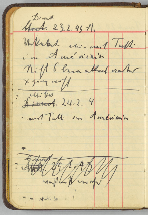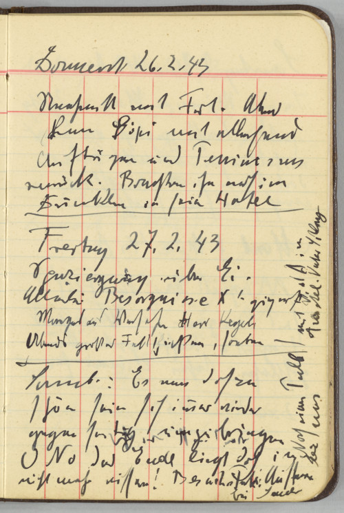 °Mitt. 25.2.43 ~Donnerst~ / weiß nicht mehr° / Donnerst. 26.2.43 / Nachmittag mit Frl. Abend / kam Göpi mit allerhand / Aufträgen und Pessmismus / zurück. Brachte ihn noch im / Dunkeln in sein Hotel