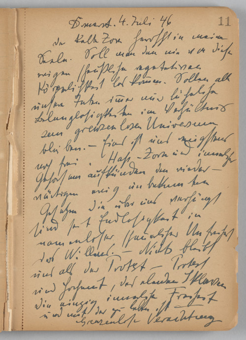 Donnerst. 4. Juli 46 / Der kalte Zorn herrscht in meiner / Seele. Soll man den nie von dieser / ewigen scheußlichen vegetativen / Körperlichkeit loskommen. Sollen alle / unsere Taten immer nur lächerliche / Belanglosigkeiten im Verhältnis / zum grenzenlosen Universum / bleiben. – Eins ist uns wenigstens / noch frei. Haß – Zorn und innerlicher / Gehorsam aufkünden den wieder – / wärtigen ewig unbekannten / Gesetzen die über uns verhängt / sind seit Endlosigkeit in / namenloser schauerlicher Unfreiheit / des Willens. – Nichts bleibt / uns als der Protest – Protest / und Hochmut, des elenden Sklaven / die einzig innerliche <Freiheit> / und mit der zu – leben ist – / Grenzenlose Verachtung / gegen die geilen Lockmittel / mit der wir immer wieder / an die Candarre des / Lebens zurückgelockt / werden. Wenn wir dann / halb verdurstet unseren / Durst löschen wollen / erscheint das Hohngelächter / der Götter. – Salz / leckst du armer / größenwahnsinniger Sklave / und du tanzt lieblich / und unendlich komisch / in der Arena der / Unendlichkeit unter / dem tosenden Beifall des / göttlichen Publikums. / Je besser du's machst um / so komischer bist du. / Am Komischten die / Asketen die sich / immer noch eine neue / Sinnlichkeit im Entsagen / oder Selbstpeinigen / erfinden – Am traurigsten / der absolute Wollüstling / weil er Pech säuft / statt Wasser. / – Halten wir uns an / die Verachtung. –
