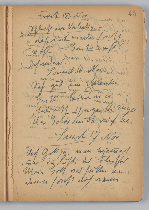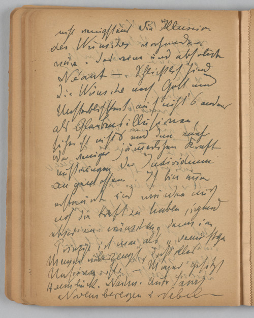 <Sonnt 17 Nov / Ach Gott ja, man bejammert / immer die Lüste des Fleisches. / Mein Gott was hätten wir / denn sonst noch wenn / nicht wenigstens die Illusion / des Wunsches vorhanden / wäre. Das eine und absolute / Néant – Schließlich sind / die Wünsche nach Gott und / Unsterblichkeit auch nicht’s anders / als Glaubensillusionen. / Sicher ist nicht’s und dem mehr / oder weniger jämmerlichen Kraft / anstrenungen [?] der Individuen / angemessen. Ich bin immer / erstaunt und wundere mich / noch die Kraft zu haben, irgend / etwas zu wünschen, denn im / Prinzip ist man als „vernünftiger / Mensch überzeugt, daß alles / Unsinn ist. – Morgens gefitzt / Heembruck. Nachm. Auto Savoy / Novemberegen u. Nebel