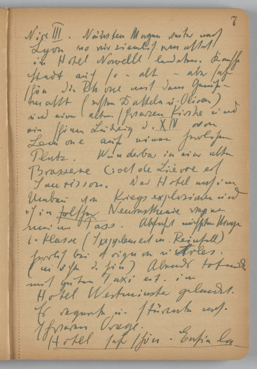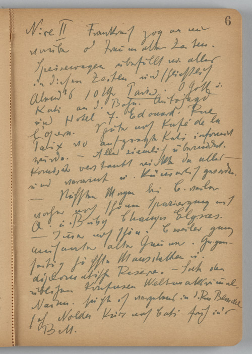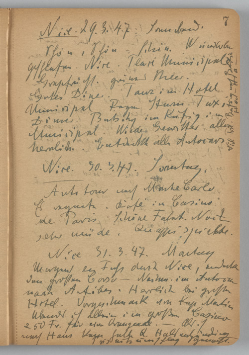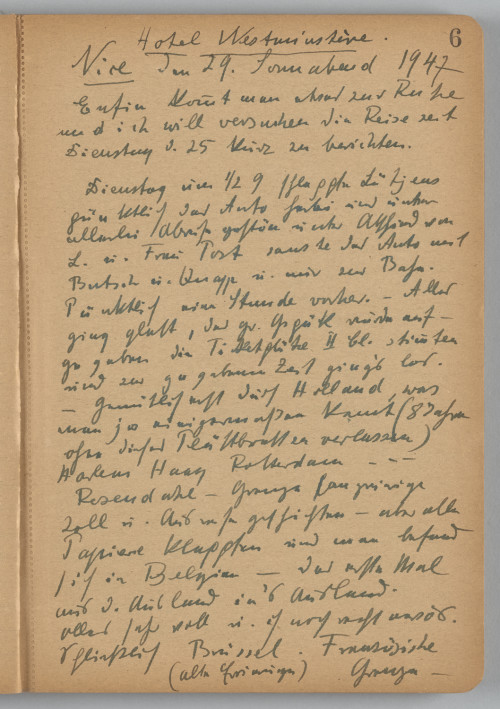 <Hotel Westminstère>. / <Nice> den 29. Sonnabend 1947 / Enfin kommt man etwas zur Ruhe / und ich will versuchen die Reise seit / Dienstag d. 25 kurz zu berichten. / Dienstag um ½ 9 schleppte Lütjens / pünktlich das Auto herbei und unter / allerlei Abreisegetöse unter Abschied von / L. u. Frau Post sauste das Auto mit / Butsch u. Quapp u. mir zur Bahn. / Pünktlich eine Stunde vorher. – Alles / ging glatt, das gr. Gepäck wurde auf- / gegeben die Ticketplätze II Cl. stimmten / und zur gegebenen Zeit ging’s los. / – Gemütlich erst durch Holland, was / man ja einigermaßen kennt (8 Jahre / ohne dieses Plättbrett zu verlassen) / Harlem Haag Rotterdam – – – / Rosendahl – Ganze langwirige / Zoll u. Ausreisegeschichten – aber alle / Papiere klappten und man befand / sich in Belgien – das erste Mal / aus d. Ausland in’s Ausland. / Alles sehr voll u. ich noch recht nervös. / Schließlich Brüssel. Französische / (alte Erinungen) Grenze – / Nice II Frankreich zog an mir / vorüber o Traum alter Zeiten. / Speisewagen überfüllt wie alles / in diesen Zeiten und schließlich / Abend’s 10 Uhr <Paris>. O Gott u. / Kati an d. Bahn. Autojagd / und Hotel 7. Edouard. Rue / l’opera. Später noch Kafé de la / Paix wo aufgeregte Kati informirt / wurde. – Alles ziemlich übermüdet. / Komisch verstaubt wirkte da alles – / und verarmt u. kümmerlich geworden. / – Nächsten Morgen bei C. weiler / vorher noch schönen Spaziergang mit / Q. u. Butsy Champs Elysses. / – Immer noch schön. C weiler ganz / amüsanter alter Gauner. Gegen- / seitig höchste Manschetten u. / diplomatische Reserve. – Sah den / üblichen konfusen Weltmaksrummel. / Nachm. suchte ich vergebens in d. Rue Blanche [?] / sah Noldes kurz noch Cati früh in’s / Bett. / Nice III. Nächsten Morgen weiter nach / Lyon wo wir ziemlich ermattet / im Hotel Novelle landeten. Komische / Stadt auch so – alt – aber sehr / schön die Rhone mit dem Gemüse- / markt (erste Datteln u. Oliven) / und einer alten schwarzen Kirche und / ein schöner Ludwig d. XIV von / Lemone auf einem herrlichen / Platz. Wunderbar in einer alten Brasserie Civet de Lièvre et / Saucisson. Das Hotel noch im / Umbau von Kriegsexplosionen und / ich in <falscher> Neurasthenie wegen / meinem Pass. Abfahrt nächsten Morgen / 1. Klasse (Supplement m. Reinfall) / herrlich bei Avignon u. Arles. / (möchte d. hin) Abends totmüde / mit guten Taxi ect. im / Hotel Westminster gelandet. / Es regnet u. stürmte noch. / Schwerer Orage. / <Hotel sehr schön. Enfin la> / <Nice.> 29. 3. 47 Sonnabend. / Schön, schön – schön. Wunderbar / geschlafen. Nice. Place Municipale / Grapfrucht. grünes Meer. / Gutes Diner. Tanz im Hotel / Municipal Regen Sturm. Taxi / Dinner. Butschy im Käfig im / Municipal. Wieder Gewitter alles / herrlich. Entdeckte alle Autocars [re. Rand, 90 Grad gedreht:] Viel Post. Berufung nach Berlin / Ha – Ha –
