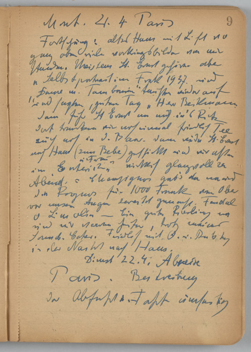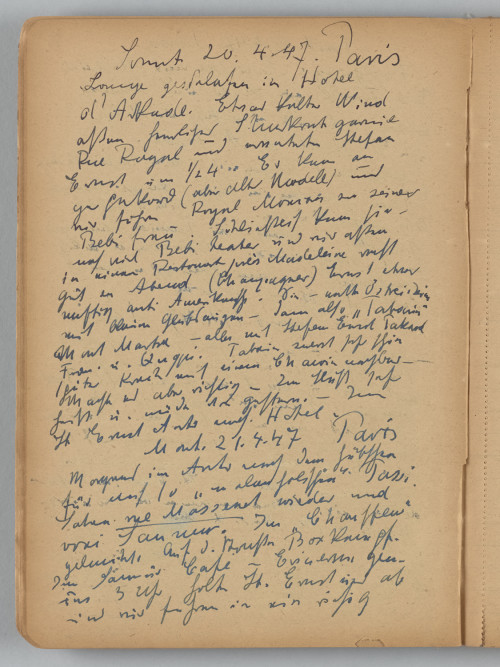 Mont. 21. 4.47 Paris / Morgens im Auto nach dem hübschen / für mich so „melanholischen“ Passi. / Sahen <rue Massenet> wieder und / vrai Saumur. Im „Chauffeur“ / geluncht. Auf d. Straße Boxkampf. / Im Saumur Café – Erinnerungen. / um 3 Uhr holte St. Ernst uns ab / und wir fuhren in ein riesig / Mont. 21. 4 Paris / Fortsetzung: altes Haus mit Lift wo / ganz oben viele workingsbilder von mir / standen. Meistens St. Ernst gehören. aber / „Selbstportrait im Frak 1937 und / „Dame m. Tambourin“ tauchten wieder auf / und sagten, guten Tag „Herr Beckmann. / Dann fuhr St Ernst un auch in’s Ritz / dort tranken wir noch einmal friedlich Tee / auch noch in d. Bar. Dann wurde St. Ernst / nach Haus (zum Bebe / u. Frau) geschickt und wir aßen / im „Enterich“ wirklich glanzvoll zu / Abend. = Champignos gab’s da na und / die Rognos für 1000 Frank vom Ober / vor unseren Augen zurecht gemacht. Feudal / o Simolin – Ein guter Riesling na / und wir waren heiter, trotz meines / Sonnab. Cater. Feierlich mit Q. u. Butschy / in der Nacht nach Haus.